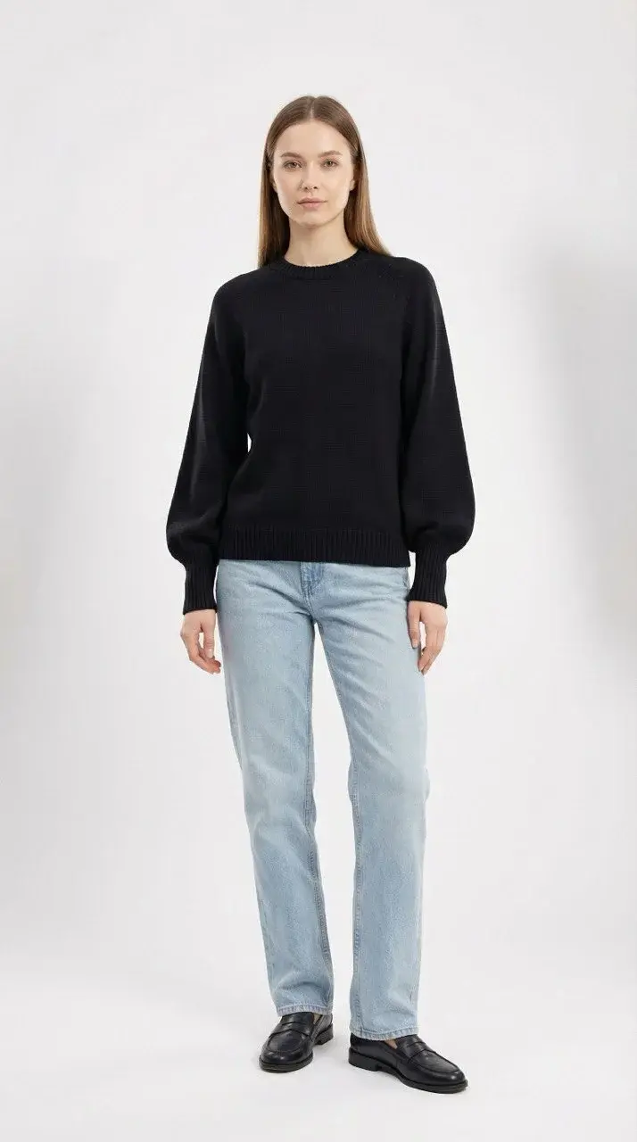Cлегка приталенный чёрный джемпер-реглан с акцентными рукавами: пышные, мягкие рукава красиво подчёркивают силуэт, а к низу сужаются в узкие манжеты, плотно облегающие запястье. Контраст между объёмом и узкой манжетой делает модель выразительной, оставаясь при этом универсальной. Пряжа гребенной меринос Zegna Baruffa millenium 3000м/100г в 6 сложений. Вес 385г. Петельная проба 33п.*50р, плотность вязания 5