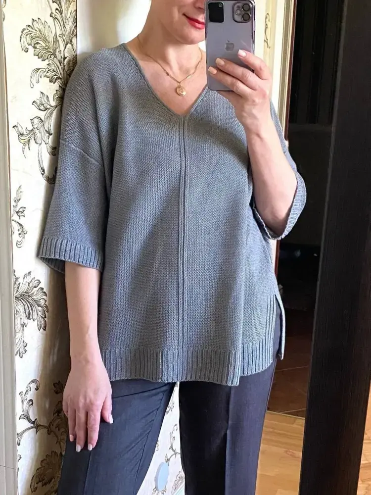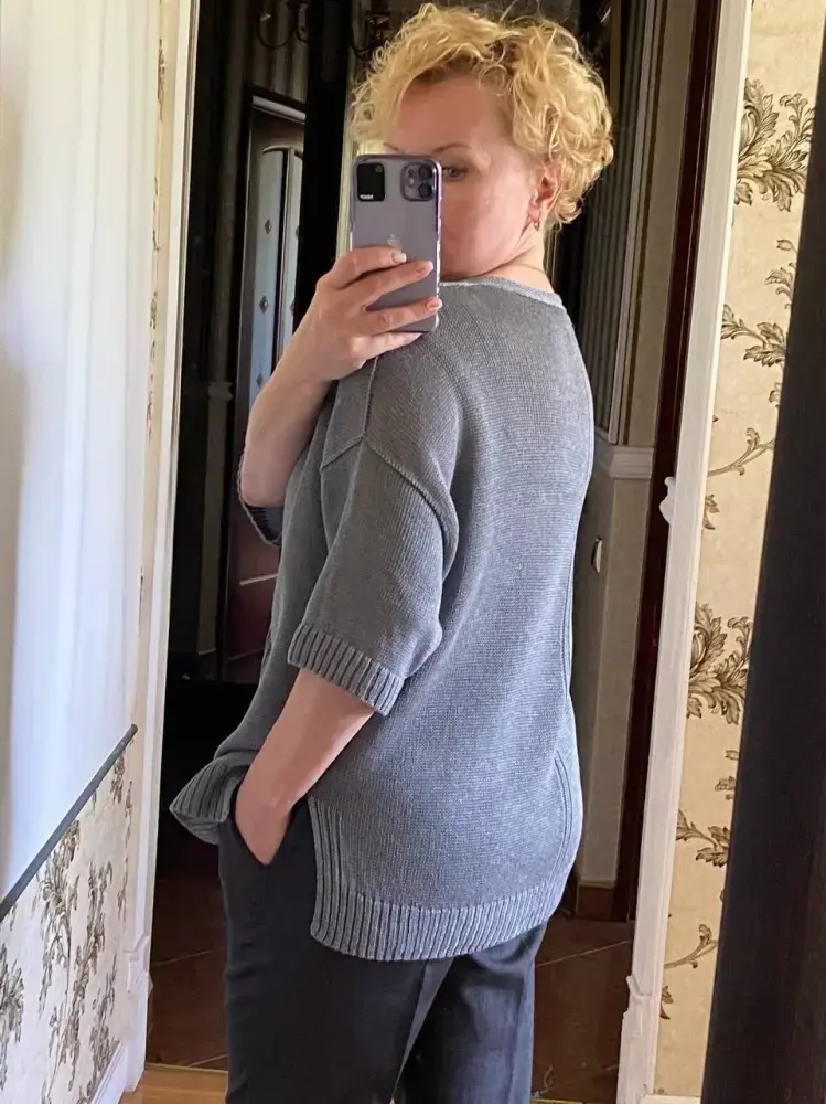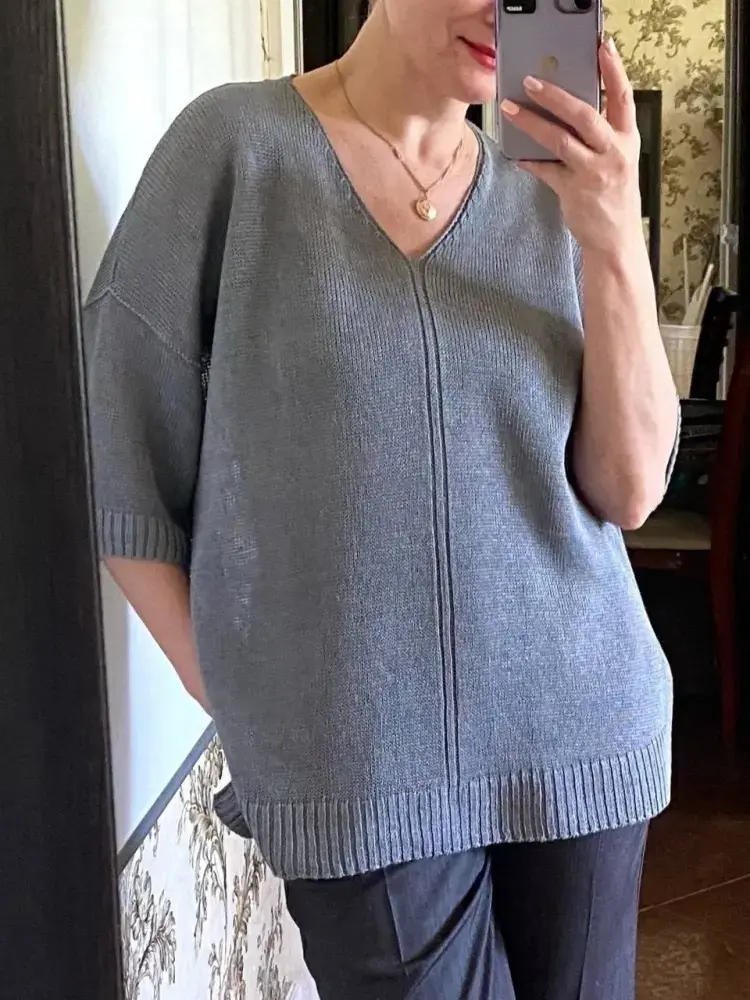 Этот джемпер — не просто базовая вещь для лета, а продуманный предмет гардероба, который экономит место в шкафу и открывает широкие возможности для создания различных образов. Он станет отличным выбором для любителей минимализма с изюминкой! 1. РАЗМЕР: 52-54, вес 300г 2. ПРЯЖА: лён 100% Ginsolino 2000м/100г в 4 сложения 3. ВЯЗАЛЬНАЯ МАШИНА: двухфонтурная 5 класса Silver Reed 4. ПЕРЕПЛЕТЕНИЯ: двухфонтурная кулирная гладь, однофонтурная кулирная гладь, промышленная резинка 5. ПЛОТНОСТЬ ВЯЗАНИЯ: основное полотно - 6/6, 5.., для резинок - 3../3.. 6. ПЕТЕЛЬНАЯ ПРОБА: 30п.*38р.
