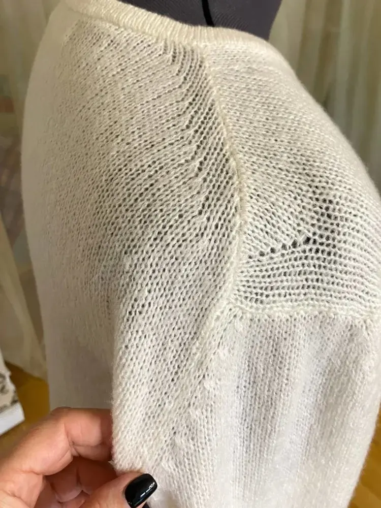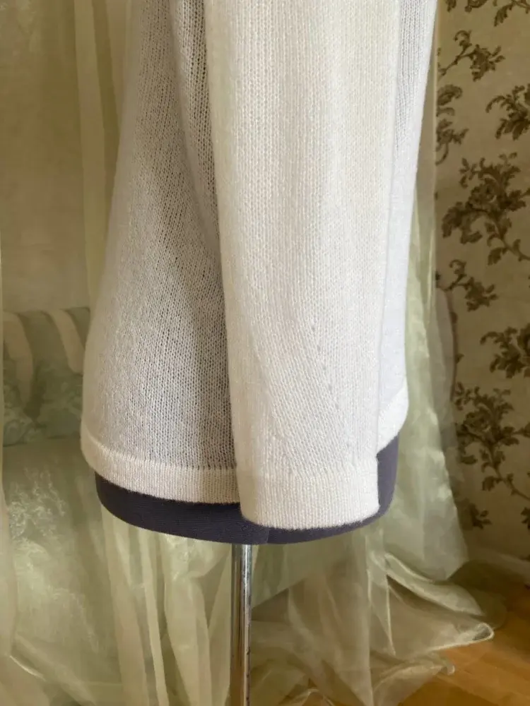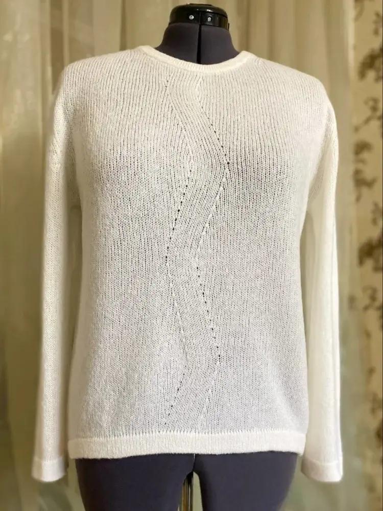 Вспушенный кашемир на шелке сочетает в себе мягкость, легкость и роскошь, а белый цвет подчеркивает чистоту и универсальность. Японское плечо — это современный крой, создающий мягкую, слегка обтекающую комфортную форму. Графический декор в виде ломаной линии — это акцент, придающий визуальный интерес, а декор на рукавах как бы продолжает линии, создавая гармонию и завершенность. Необычная линия низа в виде арки придаёт образу лёгкость и динамичность. • РАЗМЕР: 50-52, вес 200г • ПРЯЖА: Cariaggi NUAGE 74% ws 26% se 1200м в 2 нити • ВЯЗАЛЬНАЯ МАШИНА: однофонтурная 5 класса Silver Reed • ПЕРЕПЛЕТЕНИЯ: кулирная гладь • ПЛОТНОСТЬ ВЯЗАНИЯ: 8 • ПЕТЕЛЬНАЯ ПРОБА: 23п.*35р.