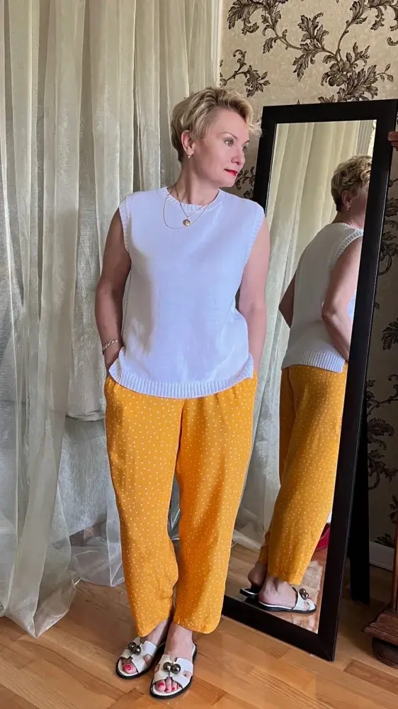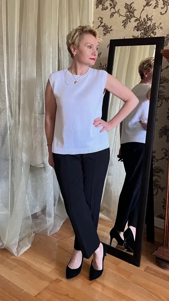 Простая белая футболка без рукавов — это универсальная вещь, которая впишется в любой гардероб, делая образ легким и непринужденным. Майку можно связать не только в белом цвете, но и в других базовых оттенках: черном, сером, бежевом или синем. Такая майка легко сочетается с различными элементами гардероба и станет незаменимой вещью в вашем арсенале. Выбор цвета зависит от ваших предпочтений. ℹ️ Пряжа полухлопок 1700м/100г в 3 сложения, плотность 5, вес 170г, петельная проба 32п*44р